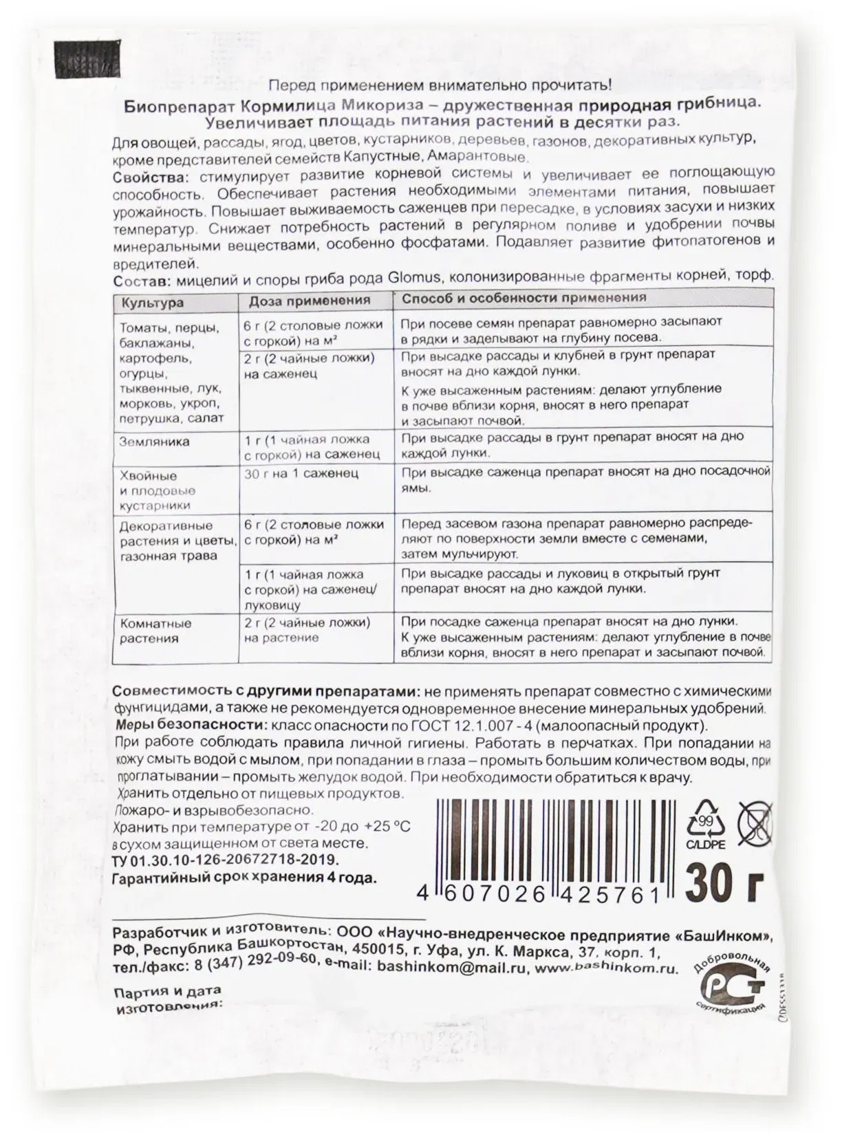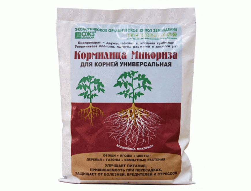 В составе препарата имеются как элементы микоризного гриба, так и колонизированные им фрагменты корней, что в разы повышает его эффективность и стабильность. Микориза, развивающаяся от живого мицелия, – самая эффективная, поскольку для роста ее достаточно слегка увлажнить. Микориза для корней рекомендован для всех садово-огородных и декоративных культур, кроме представителей семейств крестоцветные (редис, капуста, горчица, репа, редька, кресс-салат и другие) и марьевые (свекла, шпинат и другие), так как данные группы растений не способны вступать в подобные отношения. Более 90 % растений микоризируются. В составе препарата имеются как элементы микоризного гриба, так и колонизированные им фрагменты корней, что в разы повышает его эффективность и стабильность. Подавляет развитие фитопатогенов и вредителей. Снижает потребность растений в регулярном поливе и удобрении почвы минеральными веществами, особенно фосфатами. Повышает выживаемость саженцев при пересадке,в условиях засухи и низких температур.