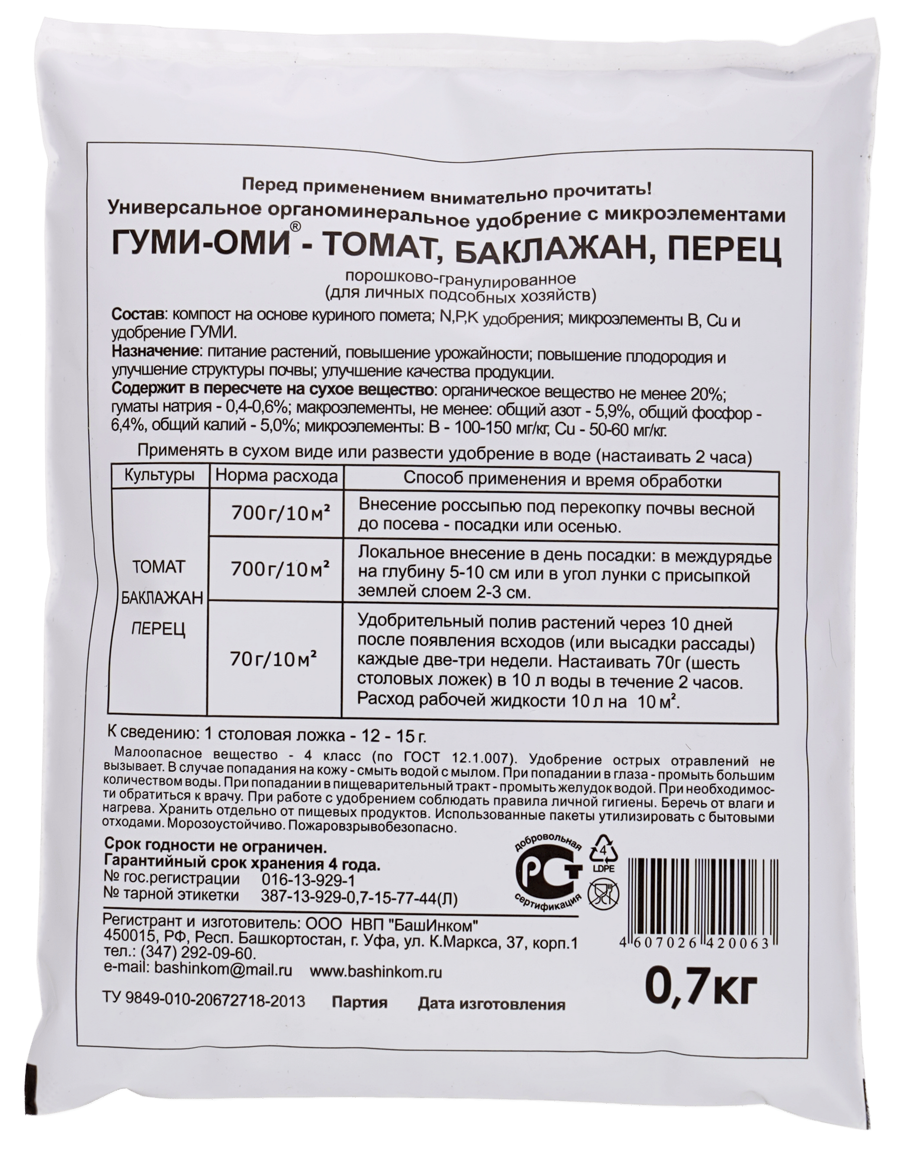 Порошково–гранулированное органоминеральное удобрение с необходимыми для питания растений макро- и микроэлементами и эликсиром плодородия Гуми. Повышает урожайность, плодородие, улучшает структуру почвы, качество продукции.