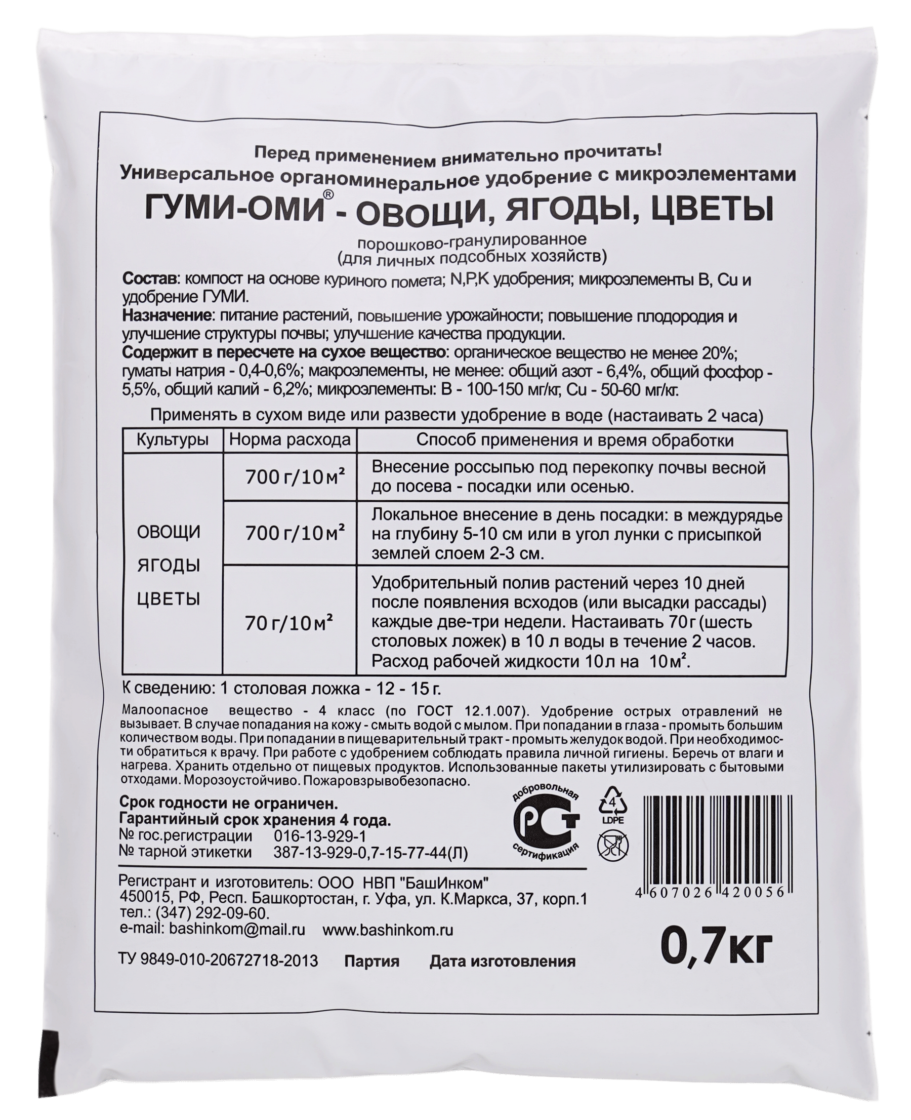 Порошково–гранулированное удобрение с необходимыми для питания растений макро- и микроэлементами и эликсиром плодородия Гуми. Повышает урожайность, плодородие, улучшает структуру почвы и улучшает качество продукции.
