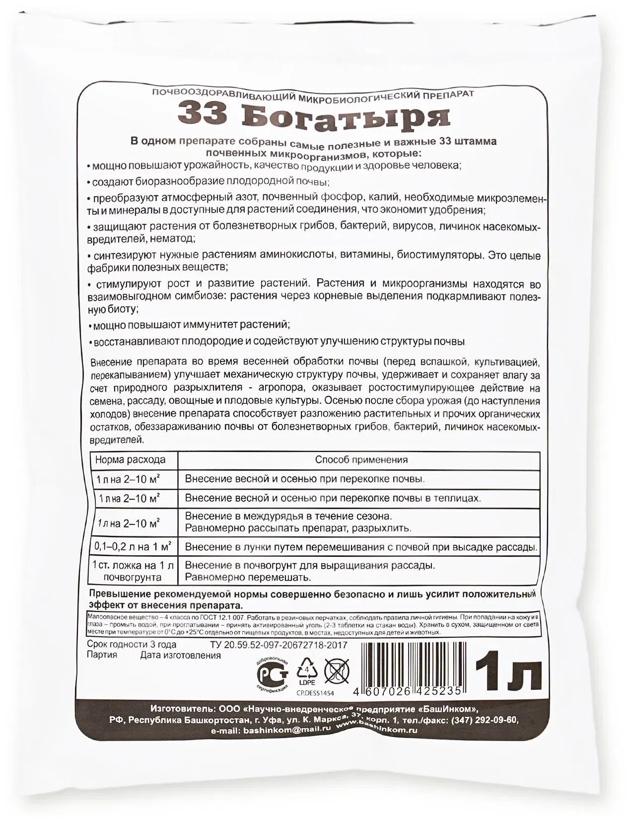 Уникальный почвооздоравливающий, оживляющий, восстанавливающий плодородие почвы микробиологический препарат. Он содержит более 40 штаммов полезных почвенных микроорганизмов на органическом и минеральном носителе.